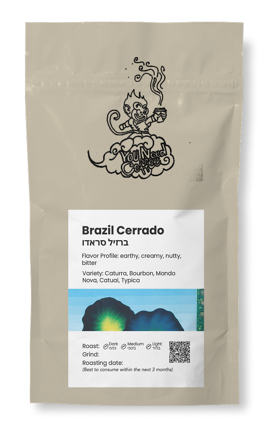 קפה ברזילאי קלאסי מאזור סראדו בקלייה כהה, עם גוף מלא וקרמי וטעמים עשירים של אגוזים קלויים, שוקולד מריר וקקאו.