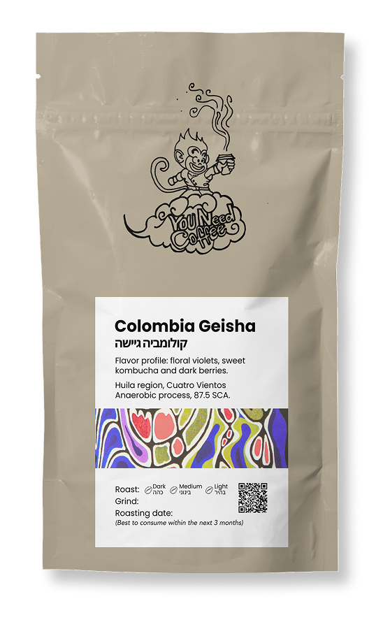 קפה קולומביאני באיכות יוצאת דופן (ציון 87.5 SCA) ומזן גיישה הנדיר מאזור הוילה של קולומביה. הקפה עם תו ״סחר הוגן״ ואורגני.